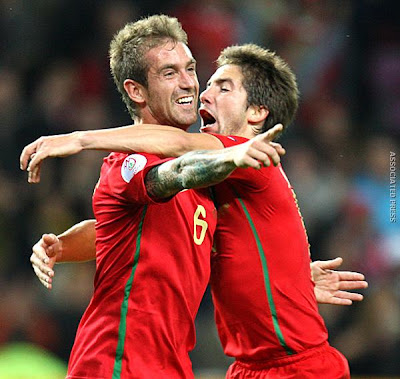 Genebra, 7 de Junho - Raul Meireles, autor do segundo golo português frente à Turquia, festeja com João Moutinho, o assistente em rodopio. Portugal deu um banho de bola. Com entrada auspiciosa no Euro'2008, a vitória, por 2-0, é curta para o domínio total dos portugueses, num jogo em que não se viu Turquia. Foto DAQUI